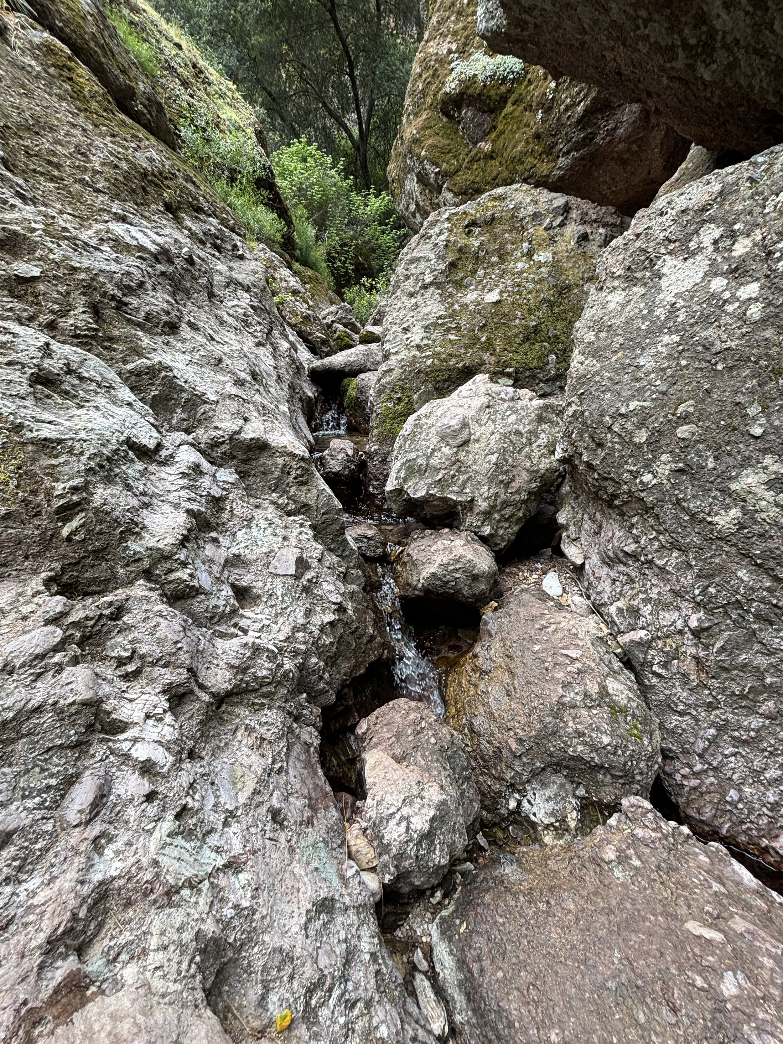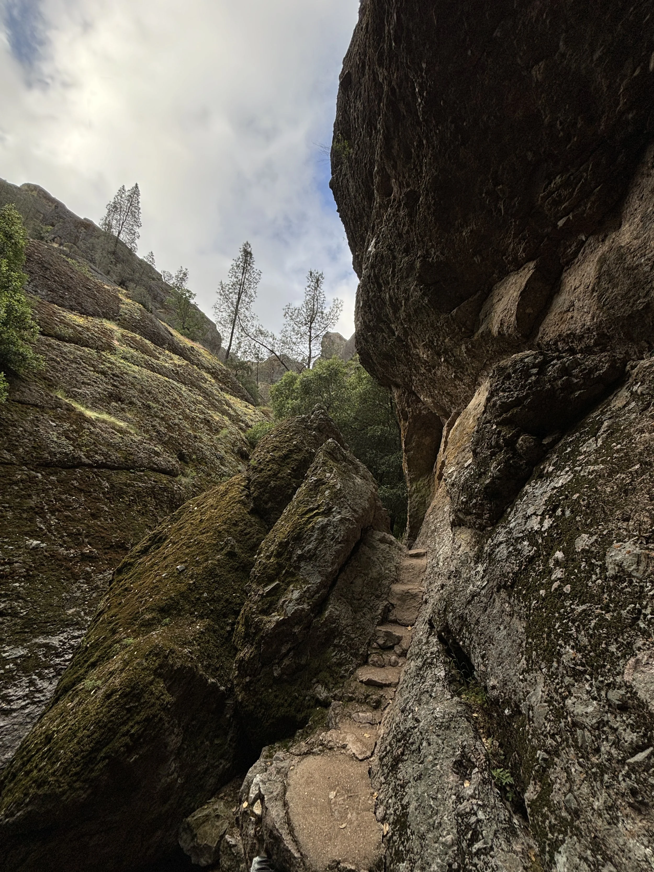 Once you hit the canyon bottom the Old Pinnacles Trail will branch left. Stay right, towards the large boulders. The trail looks like it disappears in the rocks. Look for steps cut into the rocks and follow those into a narrow canyon. Again, depending on the time of year you may follow an active river into the caves or it may be a small stream. Either way, follow the water upstream.