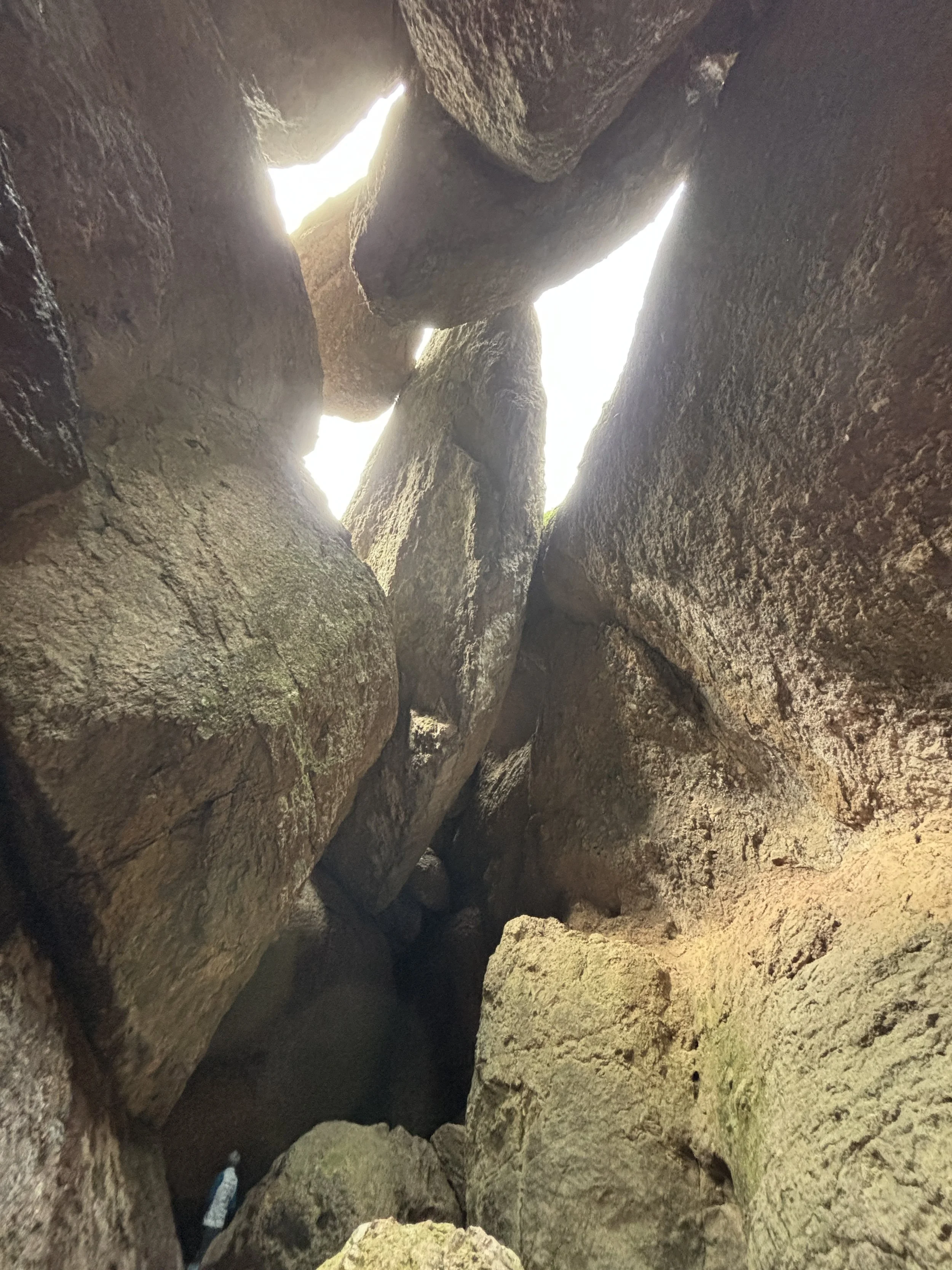 Enter the caves, change your shoes, if you choose, and get out your lights out. The trail changes into a rock staircase, kinda. You’ll have to keep an eye out for white arrows painted on the rocks. They are there to help guide the way. After a short dark section, the light comes through the cracks between the rocks making travel through the caves much easier. Be sure to look up and around. Don’t miss the famous hanging rock, a very large boulder squeezed between two rock walls that hangs just out of reach over the trail. A few more short climbs up down and around more boulders and you’ll exit the caves.