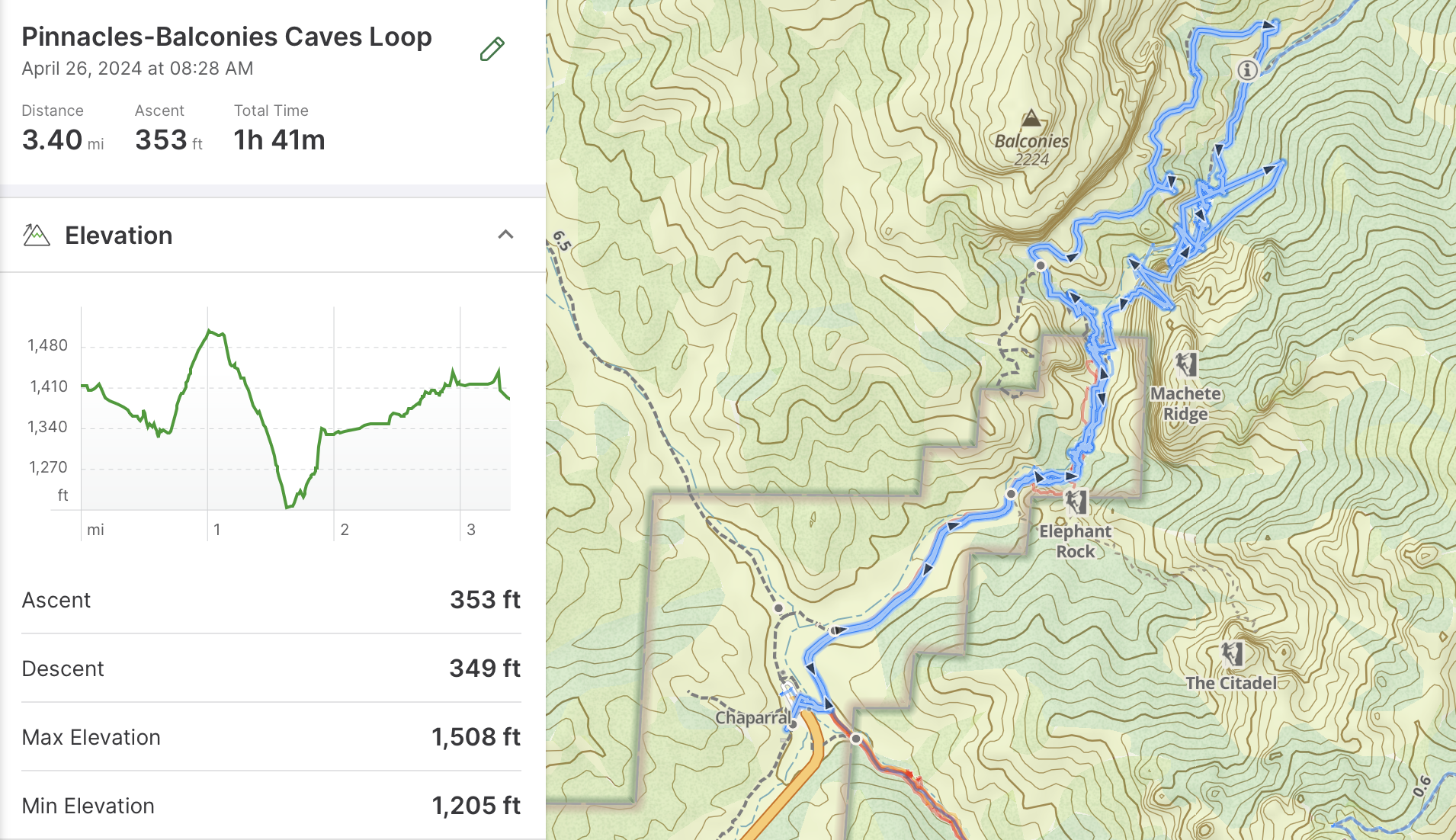 ⛰️The Balconies Caves is a fairly easy trail. It’s nearly 3.5 miles and has an elevation gain of about 350’. I recommend hiking this trail in a clockwise direction from the Chaparral parking area. This will allow you to finish at the caves, what I believe to be the best part of this hike.