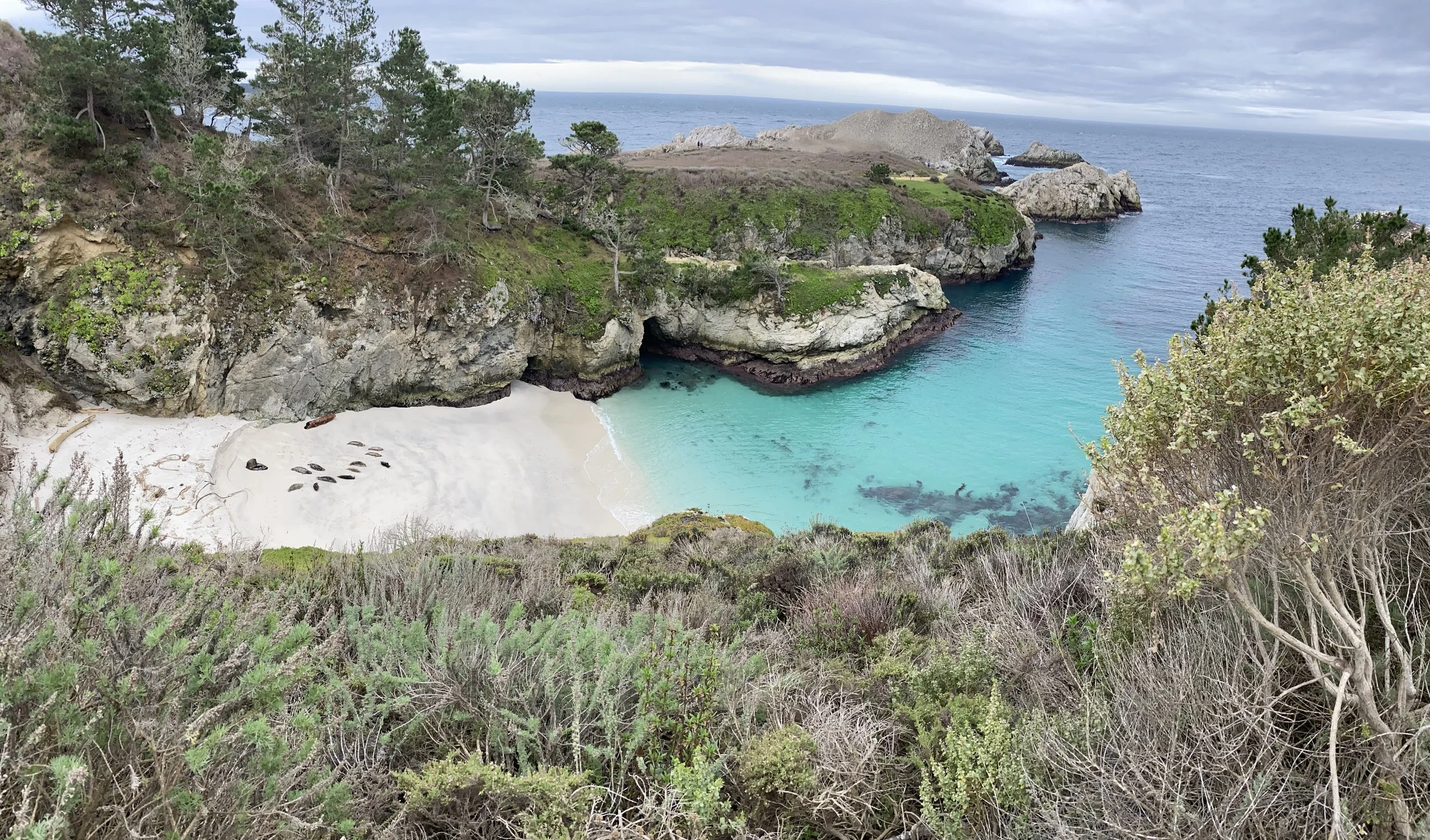 The South Shore Trail ends just past Hidden Beach, see if you can find it. At this point you’ve probably been on the trail for a few hours. The sun should be higher in the sky enhancing the next dramatic view Point Lobos has to offer. Continue to follow the Bird Island Trail past the parking lot. The trail winds around to unveil the deep blue ocean transitioning to the shallow crystal blue waters and white sandy beach of China Cove, one of the most beautiful picturesque locations in Point Lobos NSR. If you’re lucky you’ll get to see more seals napping on the beach. Don’t forget to look for the sea caves and arches. Follow the trail around China Cove to Gibson Beach, the southernmost point of Point Lobos State Natural Reserve. The trail continues out the bluff past Pelican Point to a different view of China Cove and towards Bird Rock. Don’t mind the smell, it’s a short trail. Here’ you get a good look at the Carmel Highlands, a unique enclave that sits on the cliffs of the Pacific, home to the Highlands Inn and many rich and famous.